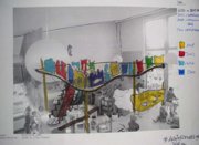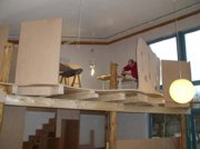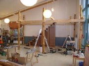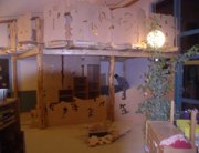 Entwurf, Statik, Projektentwicklung, Sponsoringkonzept, Zimmererarbeiten, Malerarbeiten, Elternworkshop, Hochebene mit Kiefernbaumstämmen, Bäume fällen, Trocknung in der Trocknungskammer, eingeschobene Multiplexgeländer, Schranktreppe.